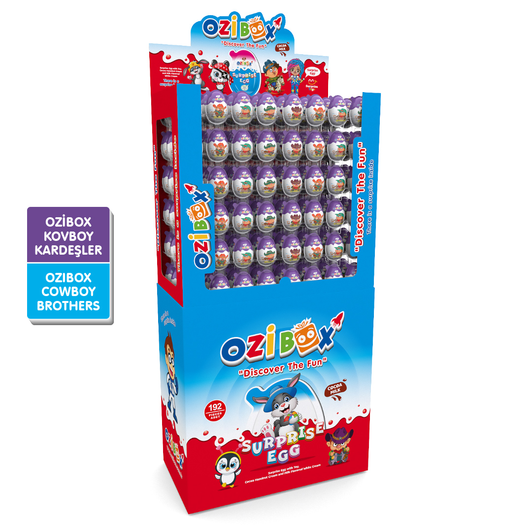Ozibox Kovboy Kardeşler oyuncaklı sürpriz yumurta, kakaolu fındık krema ve süt aromalı beyaz kremalı sürpriz yumurta eğlenceli yüzler karakter setinden oluşmaktadır.